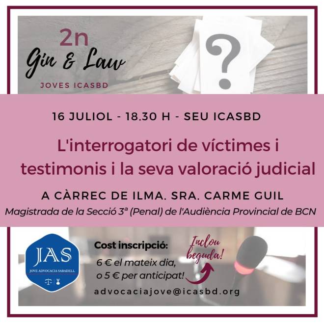El passat dimarts 16 de juliol, la Jove Advocacia Sabadell va celebrar el seu 2n Gin&Law amb el títol: “L’interrogatori de víctimes i testimonis i la seva valoració judicial“. En ella vàrem tenir el plaer de comptaramb la intervenció de la Il·lma. Sra. Carme Guil i Román, Magistrada de la Secció 3ª (Penal) de l’Audiència Provincial de Barcelona, la qual compta amb una àmplia experiència com a jutgessa i magistrada especialitzada en ViGe i menors.